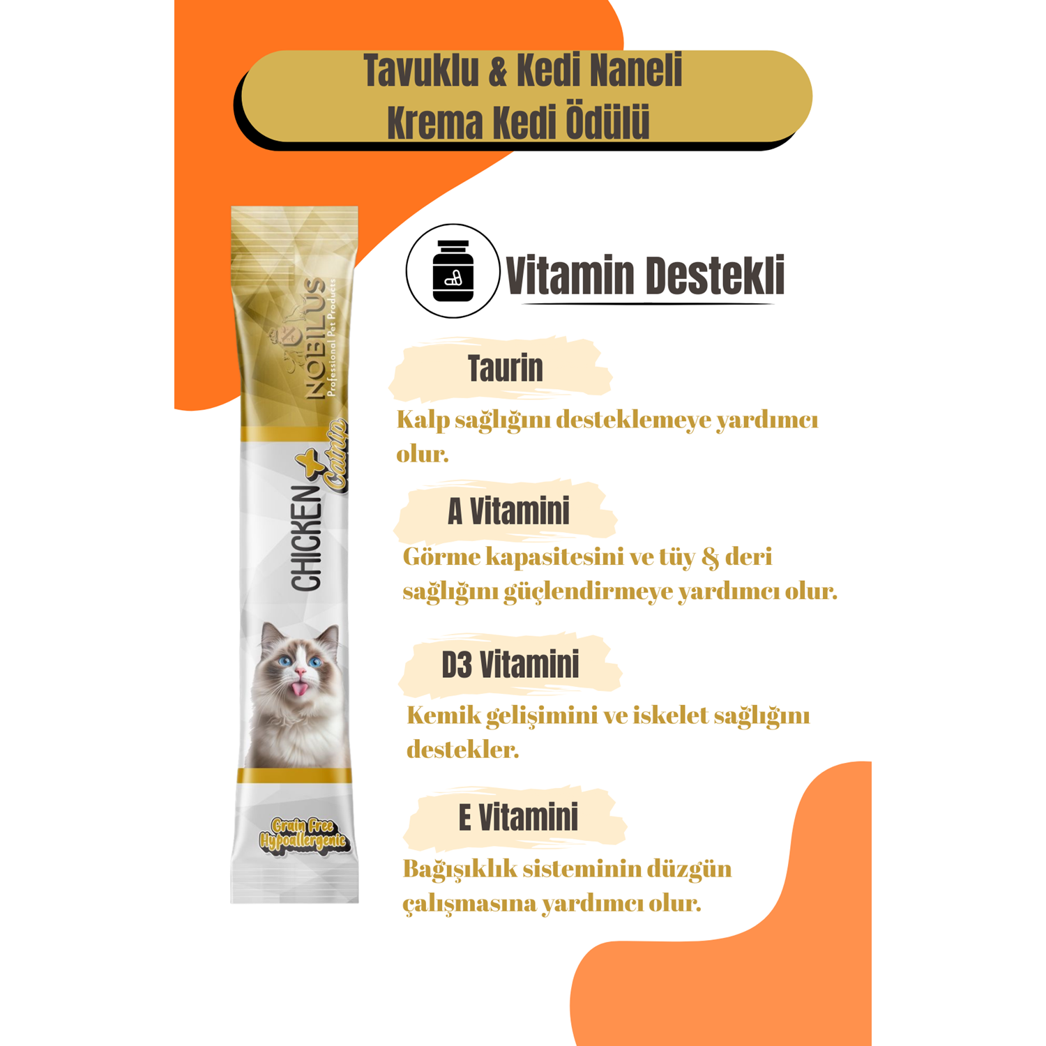 Ana bileşenler Tavuk göğsü 50%, Rafine su, Kedi nanesi 5%, Patates nişastası, Zeytinyağı Katkı maddeleri FOS, Guar sakızı 3000mg/kg, Taurin 1300mg/kg, A Vitamini 50mg/kg, D3 Vitamini 4mg/kg, E Vitamini 50mg/kg Analiz Ham Protein: ? 6,5% Ham Yağ: ? 2% Ham Lif: ? 1,8% Ham Kül: ? 2,5% Nem: ? 85%