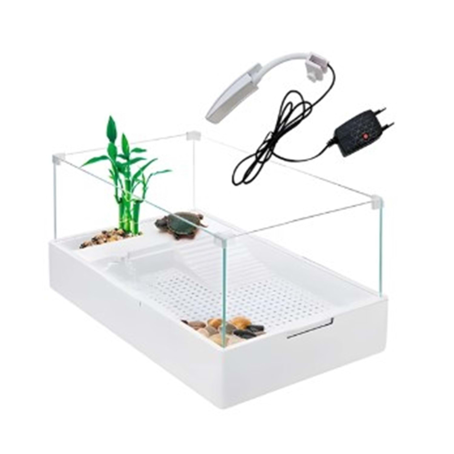 Sobo filtreli lambalı kaplumbağa tankının en önemli özelliklerinden biri, lambalı ısıtma paneli ile UV-D vitamini üretimi desteklenerek kaplumbağanın bağışıklık sistemi ve kabuk sağlığı teşvik edilir olmasıdır. Bu sayede, kaplumbağanızın ihtiyacı olan vital D vitamini sentezi doğal yollarla sağlanır, kabuk deformasyonları engellenir ve genel sağlık durumu iyileşir. Ayrıca, entegre iç filtre sistemi sayesinde suyun temiz ve oksijenli kalmasına destek vererek yosun, kötü koku ve bakteri oluşumunu engeller. Bu filtreleme sistemi, su değişim sıklığını azaltır ve akvaryumunuzun her zaman berrak ve hijyenik kalmasını sağlar.